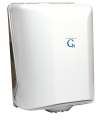 Nástěnný zásobník na papírové ručníky v roli o rozměru průměr 20x22 cm odvíjené středem. Vyroben je z bílého ABS plastu se světle šedou základnou. Je praktický do provozů kde je potřeba různě veliké jednorázové papírové utěrky jako jsou kuchyně a dílny.
